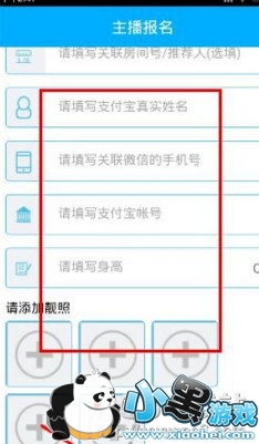 3、在主播报名界面看,输入关联房间号,支付宝真实新密,关联微信手机号,支付宝账号,身高,添加靓照,点击提交并等待审核按钮:
