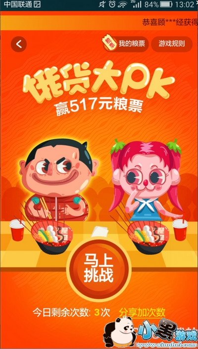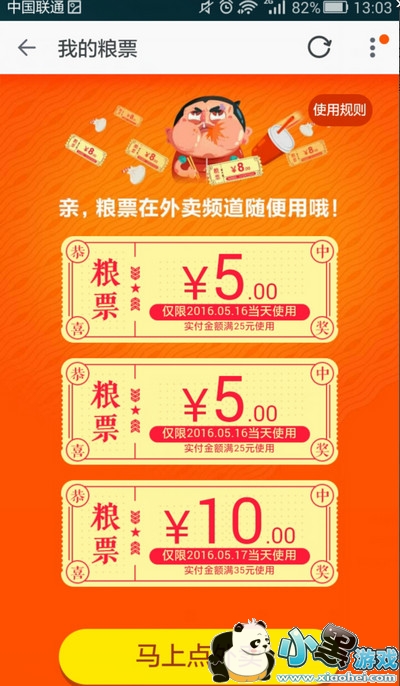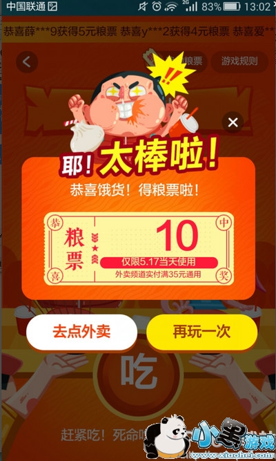 2、玩游戏胜出后,有机会获得外卖粮票,粮票面额为2元-517元不等,不同面额粮票有不同的使用门槛;