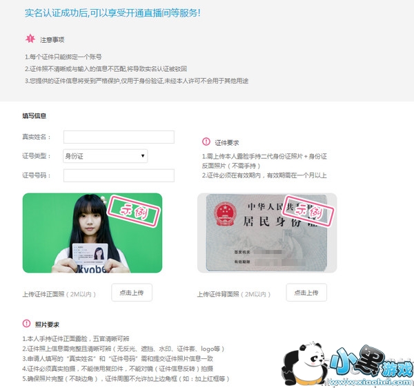 1. 需要绑定手机并经过实名认证才能获得直播权限,实名认证时需要上传您本人的身份证反面照片+手持身份证照片。