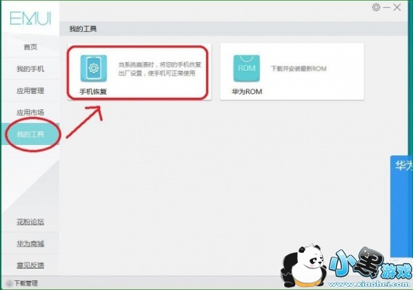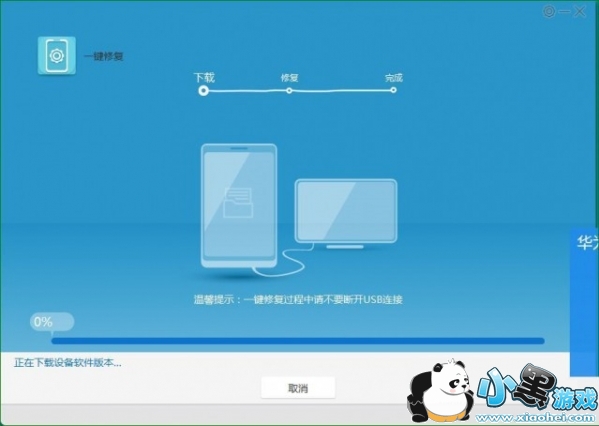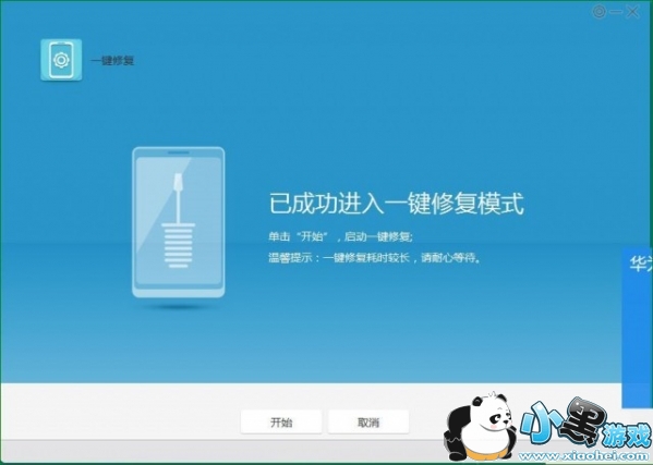 电脑中,HiSuite工具界面,我的工具,手机恢复。显示已成功进入一键修复模式后,按开始。接着,程序会自动下载相关ROM,最好是有线网络,会下快些。下载结束后开始刷机。