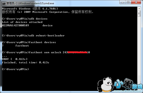 再输入fastboot oem unlock ****************,*号为16位解锁密码,例如:fastboot oem unlock 1234567812345678,回车确认,将会看到如下输出,手机将发生重启,重新进入fastboot模式,不出意外,已经解锁成功