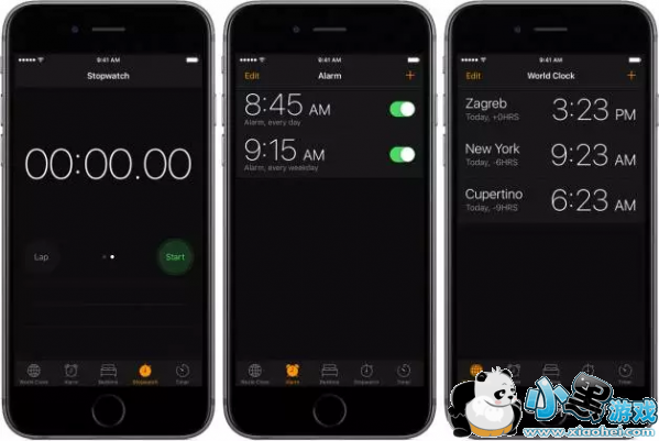 在这个黑暗模式中,并非只是系统的画面反白,看上来就几乎是把界面重新配色一样,整体感觉相当型格,在时钟App中,把下面一列的图案配成橙色,相当特别。不过从开发者所放出的截图中,就只有系统界面以及时钟App界面,暂时无法得知在其他App中运行DarkMode时会是怎样,但相信其他App需要 经过优化设计后才能完美支持DarkMode。