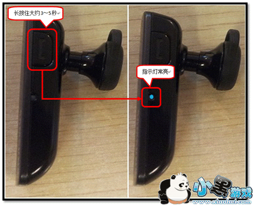 2.打开蓝牙耳机可见模式(长按住接听键大约3~5秒后,指示灯变为蓝色并常亮时松手,即可开启蓝牙耳机的可见模式)。