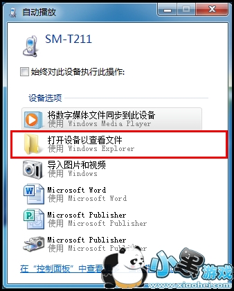 2.连接成功后,电脑桌面上会弹出移动设备盘符,用鼠标左键单击“打开设备以查看文件”(如没有弹出,您可以进入“计算机”中,找到带有该手机的移动设备盘符,鼠标左键双击打开)。