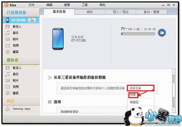 在【从非三星设备传输您的备份数据】菜单下,点击【选择设备】,并选择【苹果】。
