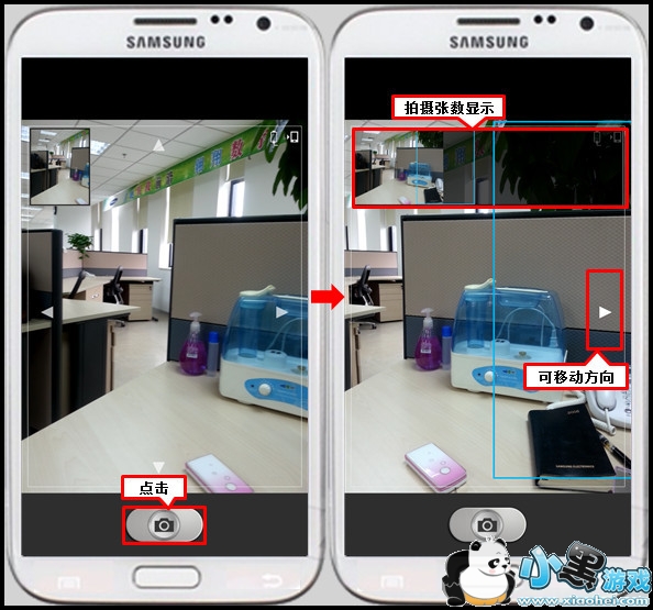 此时,选好您所需要的画面,然后点击【相机】键,朝一个方向缓慢移动手机。(屏幕上会有箭头指示您当前可移动的方向,同时手机屏幕上方还会显示已拍摄张数,提示拍摄的进度。)