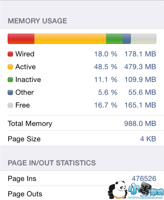 下图是TLC闪存iPhone 6 64GB的内存使用情况,当进行文件拷贝时,内存使用率会突然大幅提升。最明显的是,Inactive部分突然由93.4MB上升到232.8MB,这些文件会被iOS暂时存在内存用作为硬盘缓存,空闲部分只有28.2MB。
