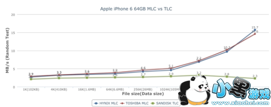 当改用随机填充测试时,TLC和MCL的性能差距明显扩大。由于系统内存难以对细小非连续的文件继续动态存取,采用TLC颗粒的iPhone 6 64GB的写入性能大幅下降至3MB/s以下。虽然采用MLC的版本表现也不是太理想,但小文件写入都在3.5MB/s,随着文件增大,表现也会明显上升。相反,TLC由于采用动态快速存取磁盘优化,对随机拷贝测试没有帮助,相反令CPU的占用率大幅度提高,导致iPhone 6出现没有反应的现象。