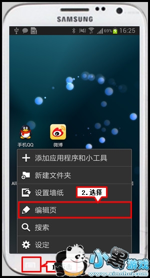 在待机页面下,点击屏幕左下角的【菜单】键,选择【编辑页】。
