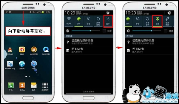1.向下滑动屏幕顶帘,点击【蓝牙】,使之变为绿色代表蓝牙开启。