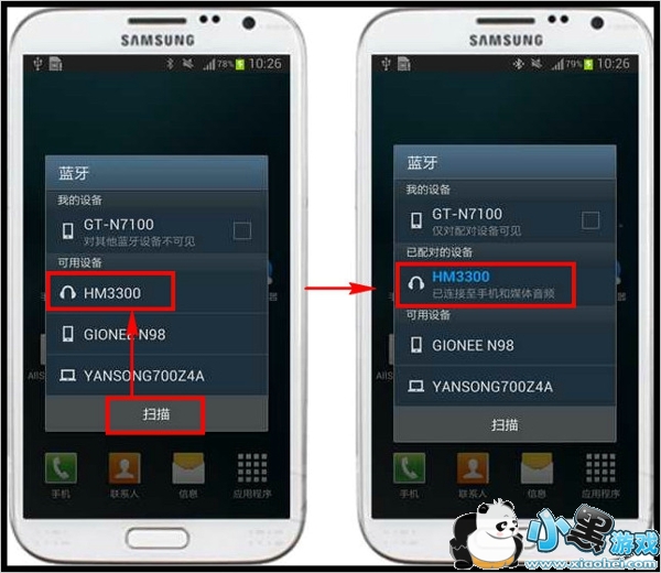 2.点击【扫描】,然后搜索到【HM3300】的可用设备后,再点击【HM3300】,屏幕会显示“已连接至手机和媒体音频”代表已经配对成功。