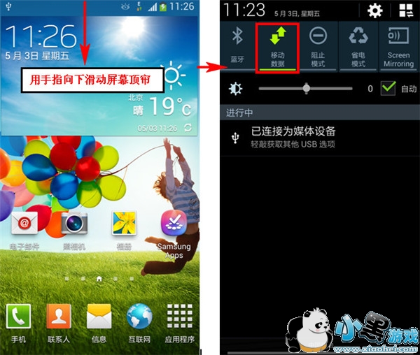 1. 用手指向下滑动屏幕顶帘,点击【移动数据】,使之变为绿色代表已开启。