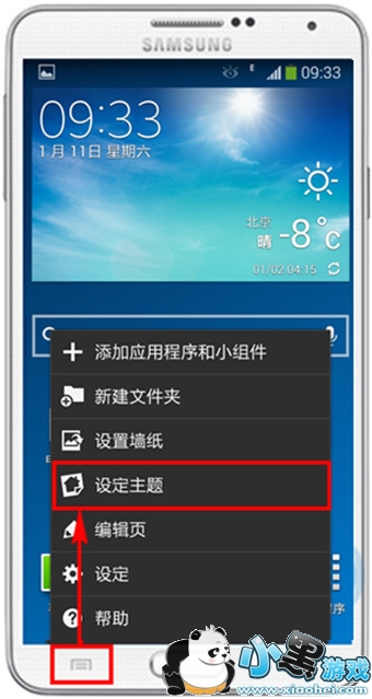 在待机页面下,点击左下角【菜单】键,并点击【设定主题】。