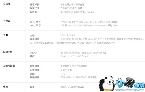 小米平板电脑主要硬件参数