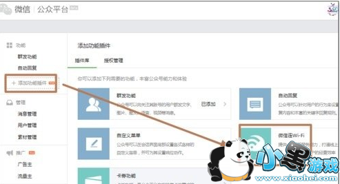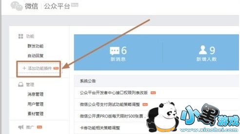 2、进入公众平台管理界面,选择:“增加功能插件”点击打开。