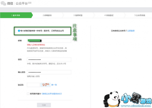 第二歩:准备一个可用的邮箱,按要求填好必选选项,和勾选《微信公众平台协议》。(如果是第一次申请,建议是新申请一个QQ邮箱)