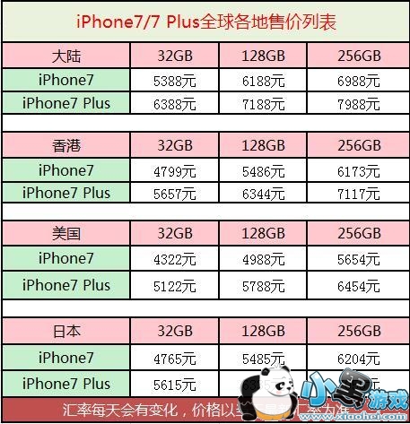 登录苹果中国官网发现,iPhone7的32GB版本、128GB版本和256GB版本的裸机售价分别为5388元、6188元和6988元。对应三款iPhone7 Plus的裸机售价分别为6388元、7188元、7988元人民币。