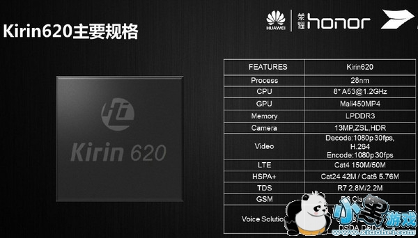 华为麒麟620采用了28纳米工艺,内建八颗Cortex-A53架构64位核心,主频为1.2GHz,八个核心可同时开启,GPU为Mali-450MP4。麒麟620集成的基带芯片可支持LTE FDD/TDD/WCDMA/TD-SCDMA/GSM等5模全频,支持LTE Cat.4标准,最高下行速率可达150Mbps。并且可双卡双网双待,支持VoLTE等4G语音技术。