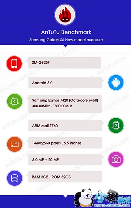 近日,Galaxy S6的配置信息在安兔兔数据库中遭到泄露,该机型号为SM-G925F,处理器升级为Exynos 7420,主摄像头升级为2000万像素。
