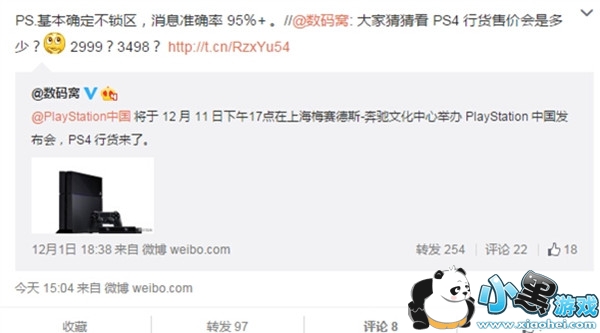 最新的微博爆料称,PS4行货有95%以上的机率不锁区,而主机售价除了上文提到的2999元之外还多出了一种可能性3498元,推测认为这两个价格分别属于标准版主机和捆绑PS4 Eye的体感套装。
