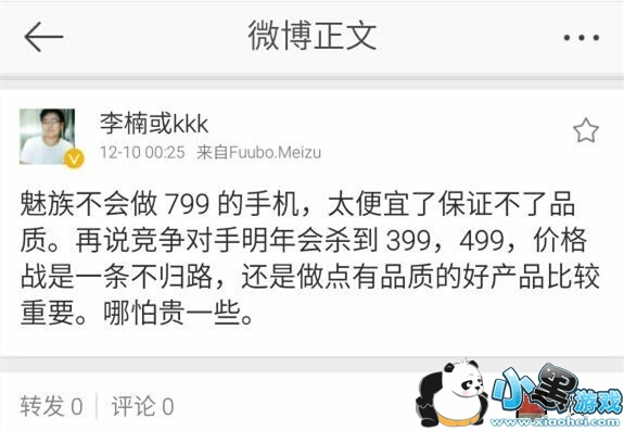 根据魅族论坛网友的爆料来看,今天凌晨,魅族副总裁李楠在微博上发表了对廉价新机的看法。李楠表示,魅族不会做799的手机,因为太便宜了保证不了质量。看来除了否认799传言之外,还在吐槽荣耀、红米等手机质量不行。