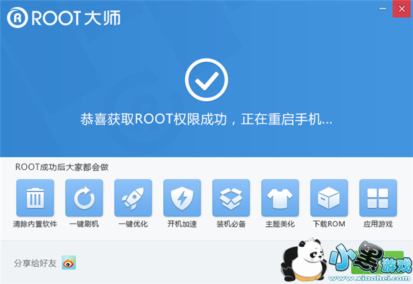 一般不超过5分钟,就会显示“ROOT权限已获取”,查看手机上多了一个ROOT大师手机版软件就表示手机已经成功ROOT了,想ROOT的用户快自己试试吧。