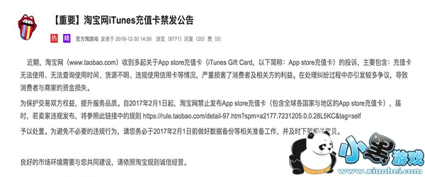 2016 年 12 月 30 日,淘宝官方发布声明称,由于遭到大量买家投诉买到的 App Store 充值卡无法使用,淘宝网将禁止售卖 App Store 充值卡(iTunes Gift Card),这项规定将从今年 2 月 1 日起执行。