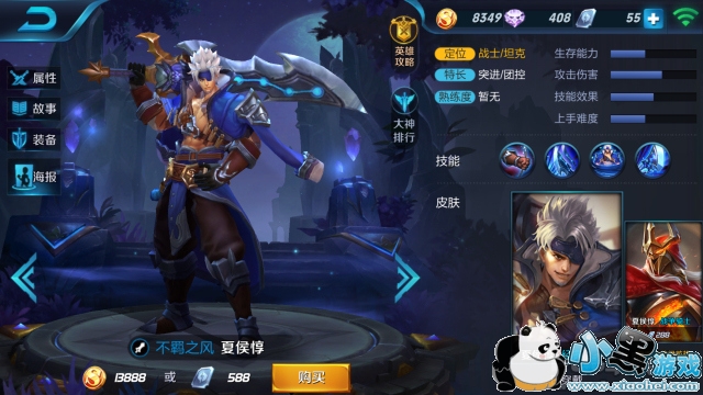 独眼美男夏侯惇是一个萌妹纸用了都会变女汉纸的英雄。能攻能“守”;强力的控制,拉风的位移,厚实的身板等都是他的代名词。当单线主T还是走双人路都非常不错;不需要占太多经济,前中期都能发挥出他的作用,上分困难症的小伙伴可以试试他哟!