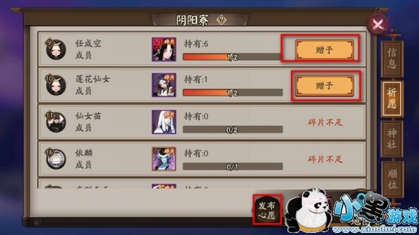 当然,如果你的式神正好却一两个,不妨通过阴阳寮当中向工会好友索要,没人每天只能发布一次心愿,而且要的东西不能太多,SSR碎片只能要一个,SR可以要两个,R可以要四个。