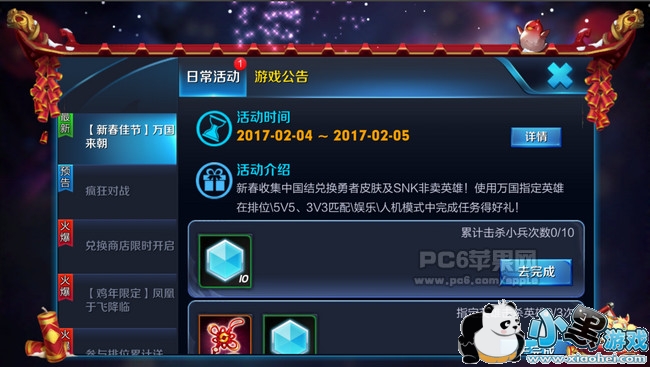 活动介绍:新春收集中国结兑换勇者皮肤及snk非卖英雄!使用万国指定英雄在排位5v5、3v3匹配、娱乐、人机模式中完成任务得好礼。