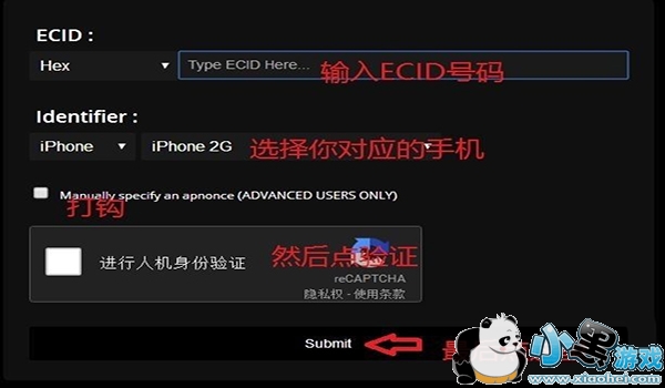 2、进入查询网址(可能需要科学上网辅助进入),输入ECID,选择对应的手机型号,并且勾选“Manually specify an apnonce (ADVANCED USERS ONLY)”,然后进行人机身份验证。