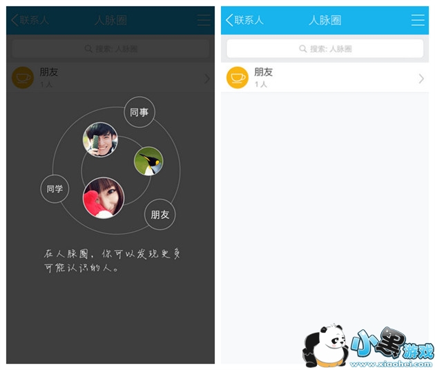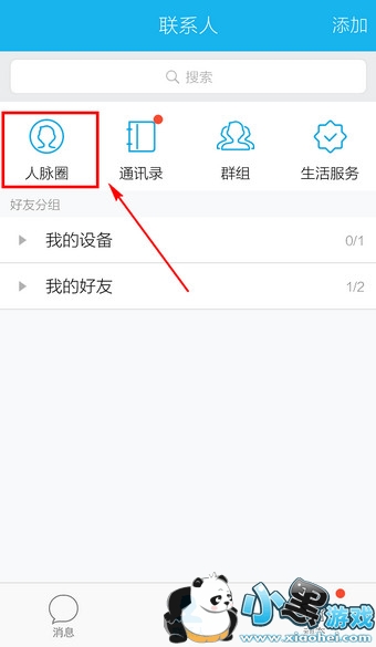 进入【联系人】后,点击左上的【人脉圈】
