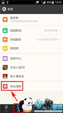 1、打开陌陌,选择【发现】栏的【地点漫游】;