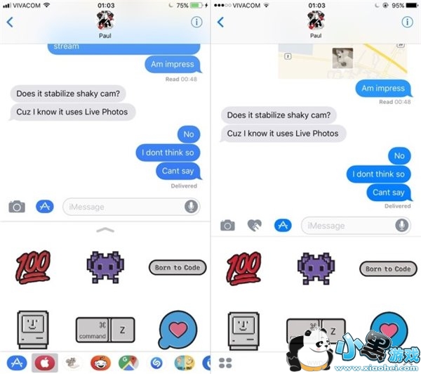 新的iMessage在底部增加了一个分享的Dock滚动条,我们可以更快速的选择需要调取的App,使用起来更方便。