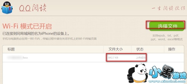 然后,浏览器会进入到QQ阅读Wi-FI模式传书界面,点击右侧“选怎文件”摁钮选中你需要上传的文件就可以立即将你的小说和相关文档长传至QQ阅读浏览。
