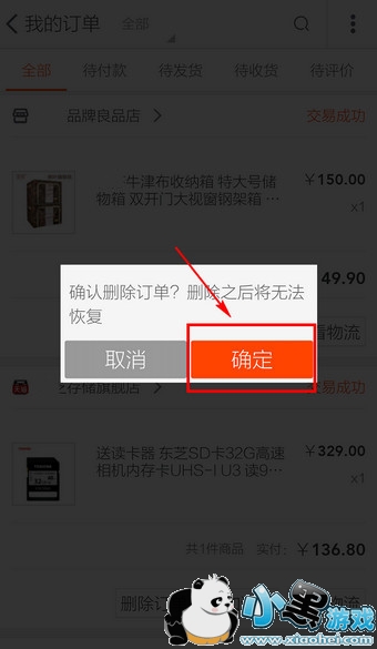 3.在每个宝贝下都有【删除订单】的按钮