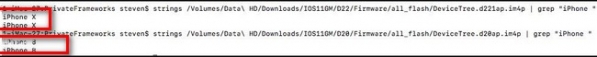 我们从下图当中的代码可以看到,有两个不同的iPhone代号分别是 iPhone X 和 iPhone 8,有了iPhone 8自然就会有 iPhone 8 Plus。