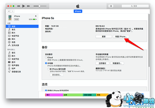3. 在 iTunes 的设备信息界面,按住 Option 键(Windows 用户在按住 Shift 键),单击「恢复 iPhone...」按钮;