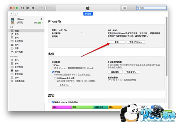3. 在 iTunes 的设备信息界面,按住 Option 键(Windows 用户在按住 Shift 键),单击「更新」按钮;