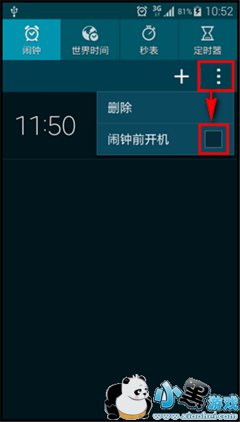 5.点击屏幕右上角的【菜单】键,将【闹钟前开机】打钩。