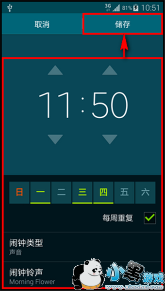 4.设定需要的闹钟时间、重复日期等相关参数,然后点击屏幕右上角的【储存】。