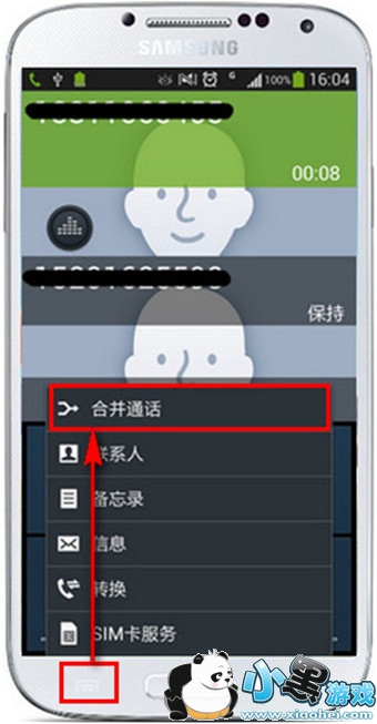 5.接通电话后,点击左下角的【菜单】键,并点击【合并通话】即可。