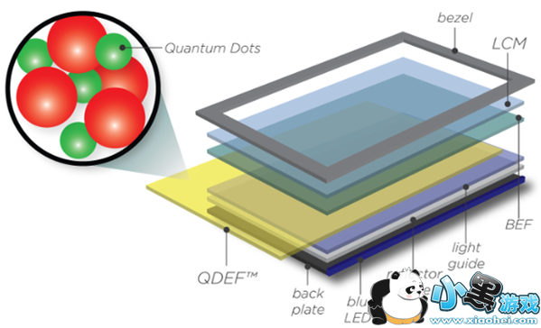 LG量子点技术通过尺寸在2至10纳米之间的纳米晶体发挥作用,每个量子点依据不同的尺寸发射出不同颜色的光。在背光源上加一层量子点薄膜可以大大提高色彩还原率和整体亮度。