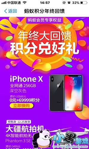 蚂蚁会员现在还在进行年终回馈,用户可以在“年终大回馈积分兑好礼”活动当中换购iPhone X、iPad Air2、飞利浦电动牙刷等商品,最高级的iPhone X可以通过69999积分免费兑换。