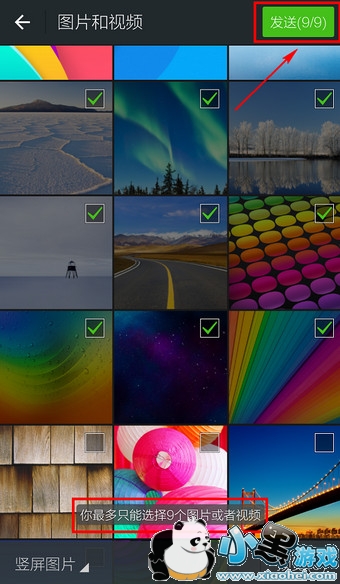 3.勾选图片(最多9张),点击右上角【发送】即可