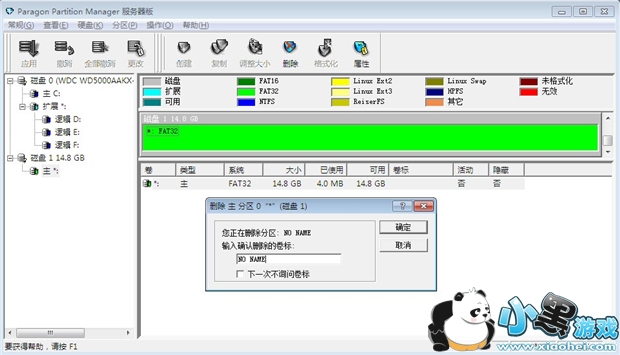 删除分区:把卡插到电脑上,然后打开软件。选择好要格式化的盘符,我这张卡是16GB的。然后点击【删除】,删除原来的分区。删除原来的分区,名字就输入"NO NAME"(大小写均可以)和上面一致就可以了。