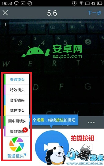接下来进入到拍摄界面,我们来说说里面的功能。下方中间是【拍摄按钮】,左边那个是镜头选择,你可以选择不同的镜头拍出不同的效果。