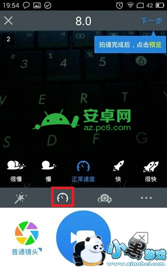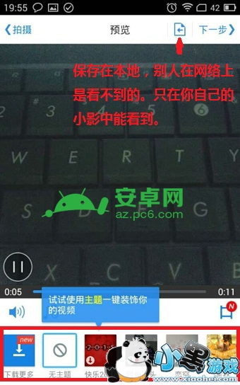 如果你拍摄完成了的话,可以点击右上角的【下一步】。进入到这里之后,你可以为你的视频添加各种效果,而上方有一个【保存到本地】的按钮。这个按钮呢,就是说你拍摄制作的视频不会发布到网络上去,只有在你自己手机的小影中能看到,而且只是二次编辑,就是说你下载点击这个视频,你还是回到这个界面,可以重新编辑。
