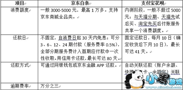 相比京东白条,支付宝花呗晚推出,但是显然掀起的浪花更大,其实这都不是重点,我们关心的是到底那个好用一些呢?这两者有什么区别呢?它们之间最重要也可能是大家最关心的一个区别就是逾期费率,花呗比京东白条要高万分之五,当然还有其他一些方面的差别,比如还款日、消费额度、还款方式都有不同。