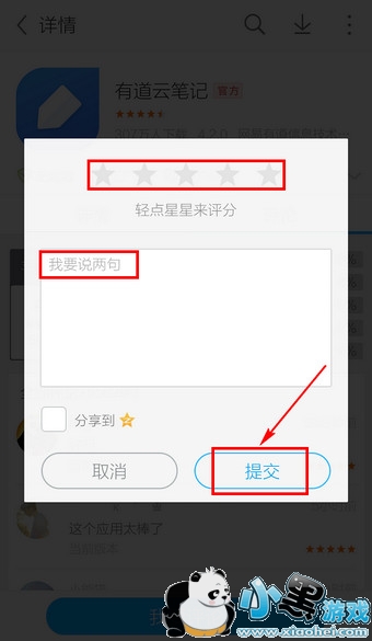 4.给APP评星,添加评语,还可以把评论分享到QQ空间,最后点击【提交】即可